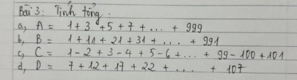 Số số hạng lẻ là: `(101 - 1) : 2 + 1 = 51` số. Tổng của số lẻ `= (101 + 1) : 2 xx 51 = 2601`. Số số hạng chẵn: `(100 - 2) : 2 + 1 = 50` số. Tổng số chẵn `= (100 - 2) : 2 + 1 = 50` số Tổng số chẵn `= (100 +2) xx 50 : 2 = 2550`. Tổng của C` = 2601 - 2550 = 51.` Rút gọnSố số hạng lẻ là: `(101 - 1) : 2 + 1 = 51` số. Tổng của số lẻ `= (101 + 1) : 2 xx 51 = 2601`. Số số hạng chẵn: `(100 - 2) : 2 + 1 = 50` số. Tổng số chẵn `= (100 - 2) : 2 + 1 = 50` số Tổng số chẵn `= (100 +2) xx 50 : 2 = 2550`. Tổng của C` = 2601 - 255... xem thêm