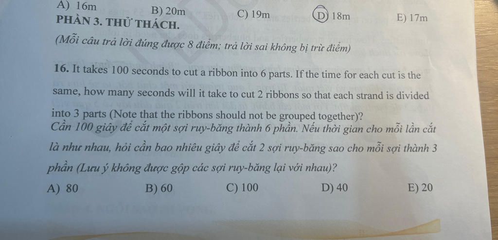 Cắt hai sợi ruy băng thành `3` phần hết thời gian là: `200 : 2 = 100` giây