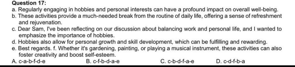 `c.` Dear Sam, I've been reflecting on our discussion about balancing work and personal life, and I wanted to emphasize the importance of hobbies. (Sam thân mến, tôi đang suy ngẫm về cuộc thảo luận của chúng ta về việc cân bằng giữa công việc và cuộc sống cá nhân và tôi muốn nhấn mạnh tầm quan trọng của sở thích.)