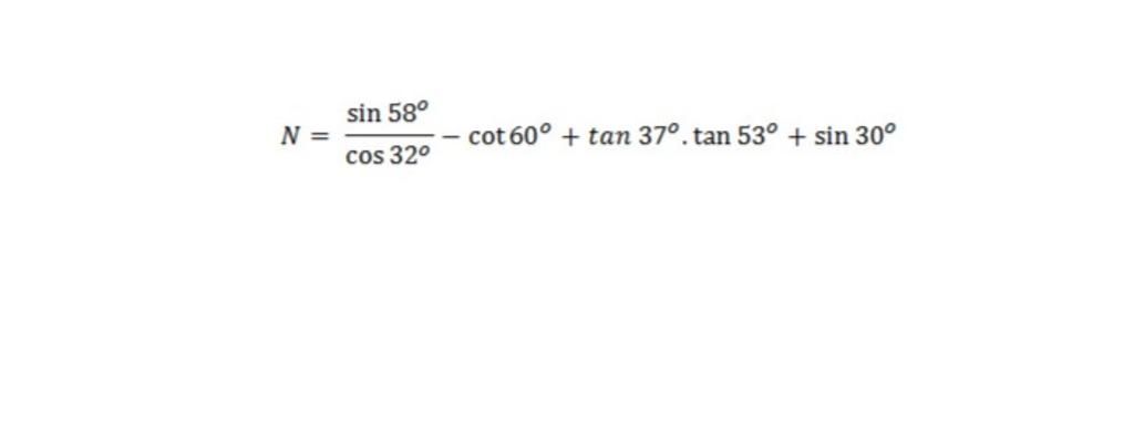 `N = (sin58^@)/(cos32^@) - cot60^@ + tan37^@ . tan53^@ + sin30^@`
