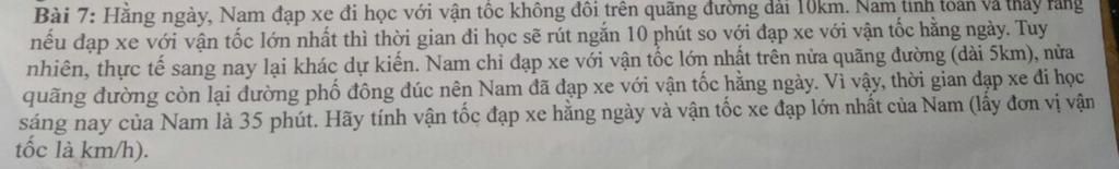 Vậy: vận tốc đạp xe hằng ngày và vận tốc xe đạp lớn nhất của Nam lần lượt là `15(km` `/` `h);20(km` `/` `h)`