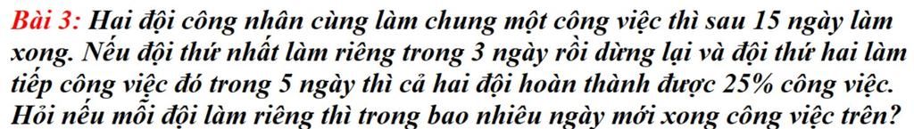 Theo bài ra đội `1` làm `3` ngày ; đội `2` làm tiếp `5` ngày thì được `25%` công việc nên ta có pt: