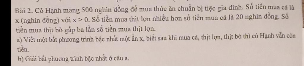 Bài 2. Cô Hạnh mang 500 nghìn đồng để mua thức ăn chuẩn bị tiệc gia đình. Số tiền mua cá là