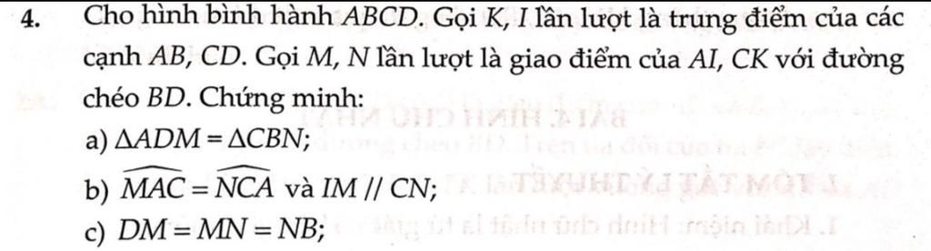 $\text{a) Vì ABCD là hình bình hành nên AB//CD và AB = CD}$ \\ $\text{$\Rightarrow$ $\widehat{CBD}$ = $\widehat{ADB}$(so le trong) và AK = IC = $\frac{1}{2}$AB = $\frac{1}{2}$CD}$ \\ $\text{Mà AK//IC nên AICK là hình bình hành $\Rightarrow$ AI//CK $\Rightarrow$ $\widehat{AMD}$ = $\widehat{BNC}$(so le trong)}$\\ $\text{Xét $\triangle$ADM và $\triangle$CBN, có:}$ // $\text{$\widehat{AMD}$ = $\widehat{BNC}$(cmt)}$ // $\text{AD = CB(vì ABCD là hình bình hành}$ // $\text{$\widehat{CBD}$ = $\widehat{ADB}$(cmt)}$ // $\text{$\Longrightarrow$ $\triangle$ADM = $\triangle$CBN(g.c.g)}$