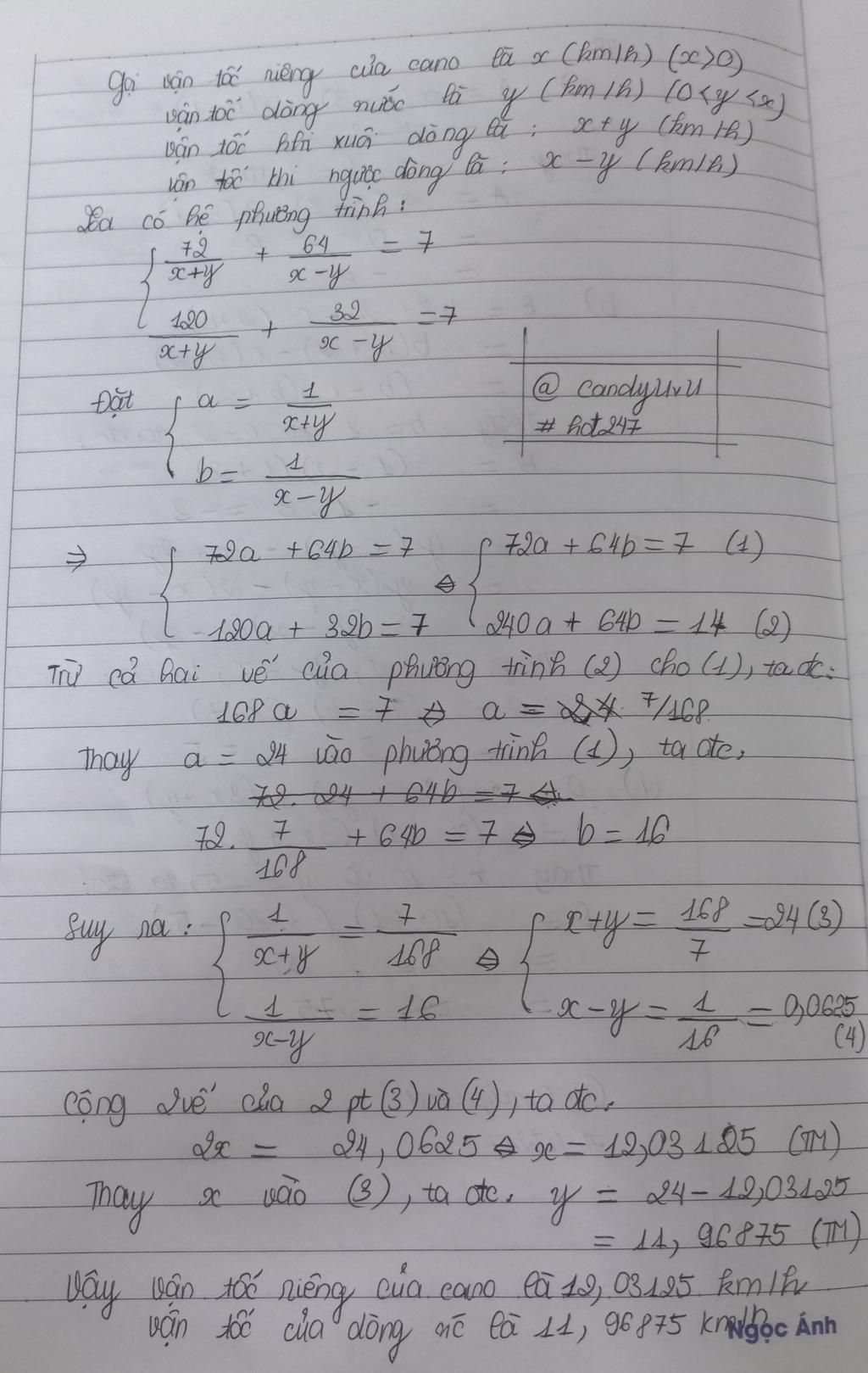 cũng hết 7h. Tính vận tốc riêng của ca nô và vận tốc của nước.( Giải bài toán bằng cách lập phương trình )