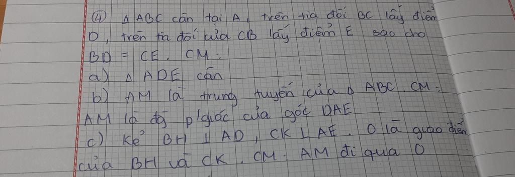 `-` Lại có `AM` là phân giác `hat{DAE}` ( chứng minh câu `b` )
