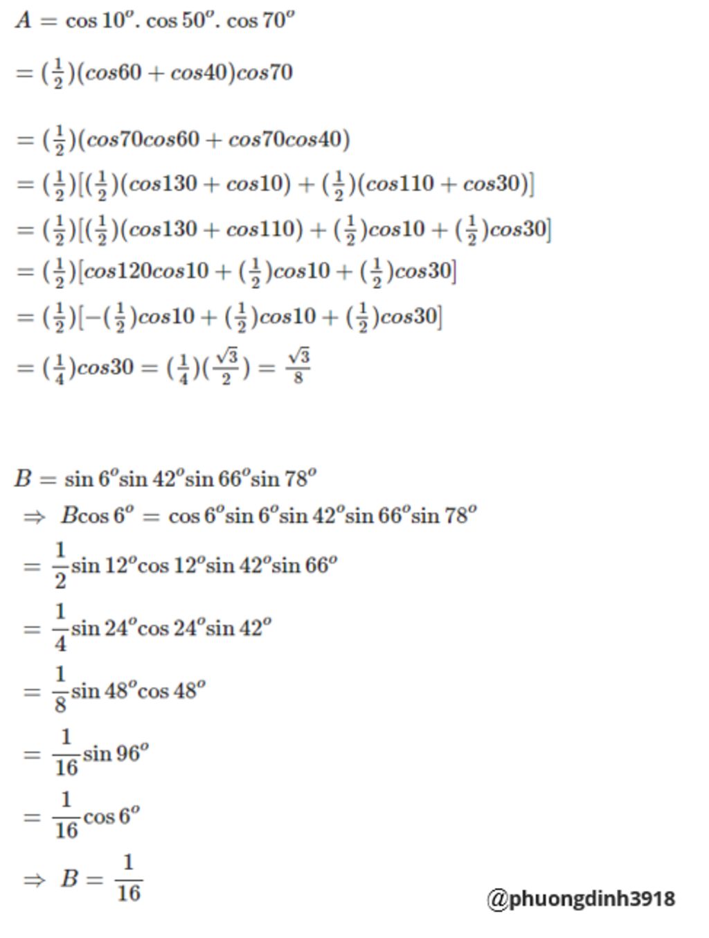 `A = cos10^o . cos50^o . cos70^o`