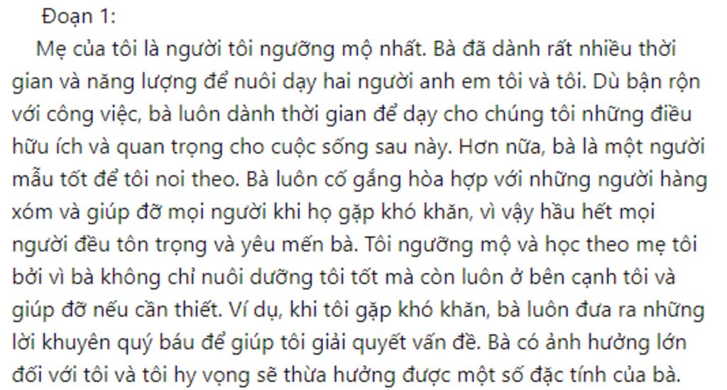 Mẹ tôi là người mà tôi ngưỡng mộ nhất. Mẹ đã cống hiến nhiều thời gian và sức lực vào việc dạy dỗ tôi và hai anh trai tôi. Mặc dù làm việc vất vả nhưng bà ấy đã luôn dành thời gian để dạy chúng tôi nhiều điều bổ ích mà cần thiết và quan trọng trong cuộc sống sau này của chúng tôi. Hơn nữa, mẹ là một tấm gương cho tôi noi theo. Mẹ luôn cố gắng sống hòa thuận với những người hàng xóm bên cạnh và giúp đỡ mọi người khi họ gặp khó khăn cho nên hầu hết mọi người tôn trọng và yêu quý bà ấy. Tôi ngưỡng mộ và kính trọng mẹ tôi không chỉ bởi vì bà nuôi dưỡng tôi tốt mà mẹ còn bên tôi và đưa ra sự giúp đỡ nếu cần thiết. Ví dụ như khi tôi gập những khó khăn thì mẹ sẽ đưa ra những lời khuyên quý giá giúp tôi giải quyết những vấn đề đó. Mẹ có ảnh hưởng lớn tới tôi và tôi hi vọng rằng tôi sẽ thừa hưởng được một số nét tính cách của mẹ.