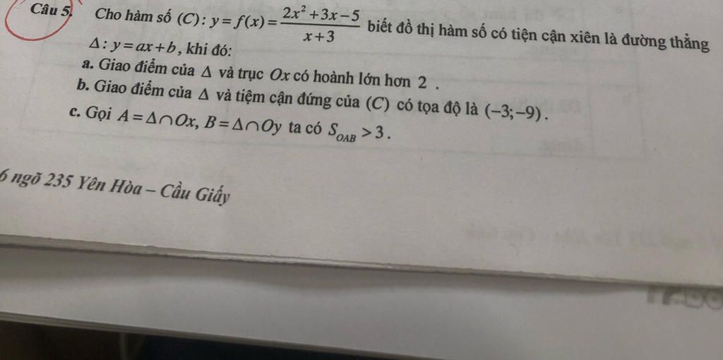 Cho hàm số (C): y= f(x) = 2x +3x-5 biết đồ thị hàm số có tiện cận xiên là đường thẳng