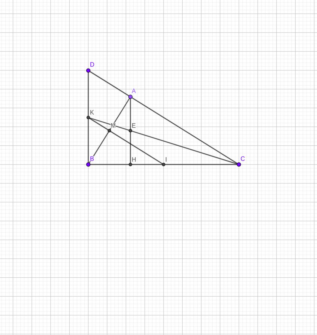 b) Qua B kẻ đường thẳng d vuông góc với BC. Gọi M là trung điểm của AB. Đường thẳng qua M vuông góc với AB cắt đường thẳng d tại K và cắt BC tại I.