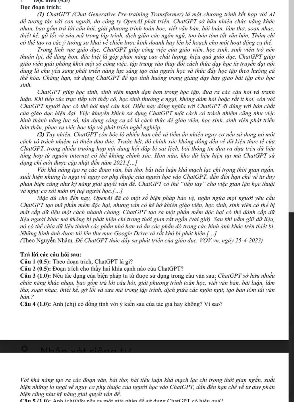 4. Em hoàn toàn đồng tình với quan điểm này. Việc học sinh, sinh viên lạm dụng ChatGPT để viết các đoạn văn, bài luận, bài thơ tốt chỉ trong thời gian ngắn sẽ dẫn đến hậu quả là phụ thuộc, lâu dần là mất khả năng tự tìm kiếm nguồn tài liệu,cách hành văn, tư duy và khả năng học tập. Vì CHatGPT đem đến các bài văn tham khảo vô cùng nhanh chóng, chính xác khiến cho con người lâu ngày dễ bị phụ thuộc