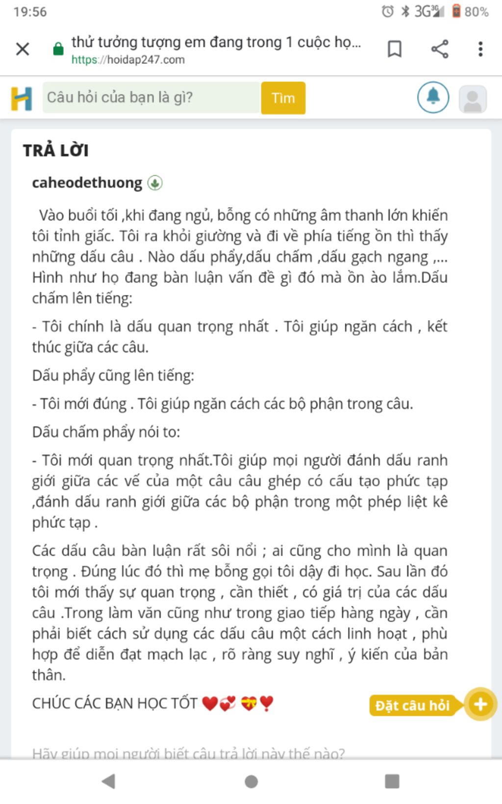 Một ngày nọ khi đang xem ti vi em bỗng nghe thấy tiếng xì xào từ phía bàn học, em lại gần bàn học xem có gì không thì phát hiện được một điều kì lạ. Ôi trời ơi ! Những dấu câu từ trong quyển vở của em đã nhảy ra ngoài ! Em lắng nghe một lúc rồi phát hiện chúng đang cãi nhau xem dấu câu nào có ý nghĩa nhất. Bác dấu chấm nói: " Dấu chấm là dấu ý nghĩa nhất vì dấu chấm được dùng nhiều nhất". Anh dấu phẩy cãi lại: " Dấu phẩy được dùng để ngắt nghỉ câu giúp cho chúng ta có thể đọc một cách lưu loát nên dấu phẩy ý nghĩa nhất". Cứ thế rồi mỗi dấu đều nói ra một ý kiến riêng, không ai chịu nhường ai. Em thấy thế bèn ra giải thích : " Mỗi dấu đều có một công dụng riêng, không thể đem ra so sánh với nhau được, dấu nào cũng quan trọng, phải có đầy đủ các dấu thì bài văn mới hoàn chỉnh và hay được." Sau khi nghe em nói các dấu câu đều vỗ tay và chúng đã làm hòa với nhau. Bỗng em nghe tiếng: "Cô mời bạn Minh lên bảng làm bài". Em giật mình hóa ra từ nãy tới giờ mình nằm mơ trong lớp học. Dù gì đi nữa, em cũng rất vui vì có một giấc mơ thú vị như thế.