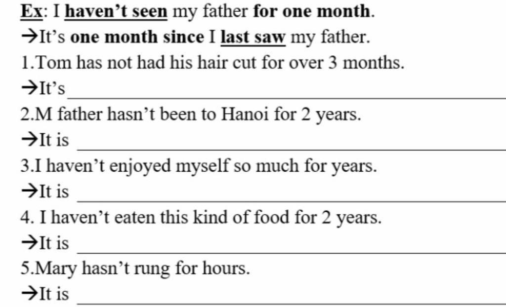 `2,` It is 2 years since my father (last) went to Hanoi.