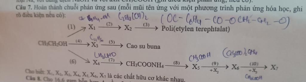 $\rm (1) C_2H_5OH\xrightarrow{170^oC,H_2SO_4(đ)} C_2H_4+H_2O \\ (2) 3C_2H_4+2KMnO_4+4H_2O \to 3C_2H_4(OH)_2+2MnO_2+2KOH \\ (3) nC_2H_4(OH)_2+nC_6H_4(COOH)_2 \buildrel{{H_2SO_4(đ),t^o}}\over\rightleftharpoons (\kern-6pt-\, OC-C_6H_4-COOC_2H_4-O \,-\kern-6pt)_n +2nH_2O \\(4) 2C_2H_5OH \xrightarrow{t^o,p,xt} CH_2=CH-CH=CH_2+H_2+H_2O \\ (5) nCH_2=CH-CH=CH_2\xrightarrow{t^o,p,xt} (\kern-6pt-\, CH_2-CH=CH-CH_2 \,-\kern-6pt)_n \\ (6) C_2H_5OH +CuO\xrightarrow{t^o} CH_3CHO+Cu+H_2O \\ (7) CH_3CHO+2AgNO_3+3NH_3 \to CH_3COONH_4+2Ag\downarrow+2NH_4NO_3 \\(8) CH_3COONH_4+HCl\to CH_3COOH+NH_4Cl \\ (9) CH_3COOH+C_2H_4(OH)_2 \buildrel{{H_2SO_4(đ),t^o}}\over\rightleftharpoons CH_3COOC_2H_4OH+H_2O \\ (10) CH_3COOC_2H_4OH+CH_3COOH \buildrel{{H_2SO_4(đ),t^o}}\over\rightleftharpoons (CH_3COO)_2C_2H_4+H_2O$