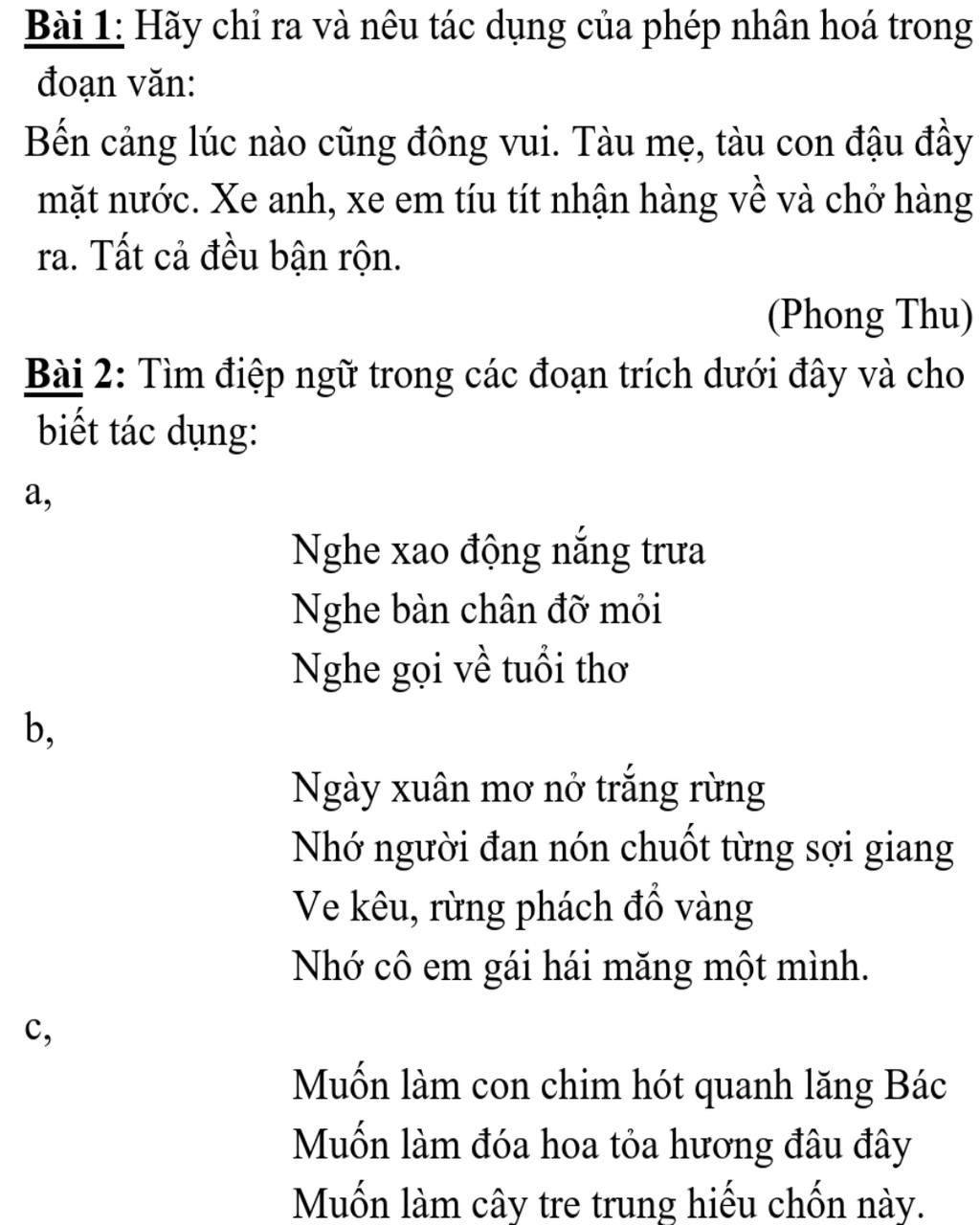 `1.` Phép nhân hoá có trong đoạn văn `:` "tàu mẹ, tàu con... Xe anh, xe em tíu tít nhận hàng về và chở hàng đi. Tất cả đều bận rộn"