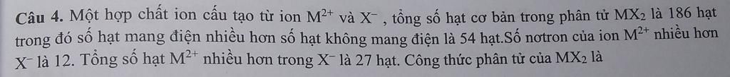 Câu 4. Một hợp chất ion cấu tạo từ ion M2+ và X, tổng số hạt cơ bản trong phân tử MX2 là 186 hạt