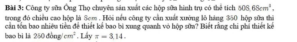 Tổng diện tích bao bì xung quanh vỏ hộp sữa là `:`