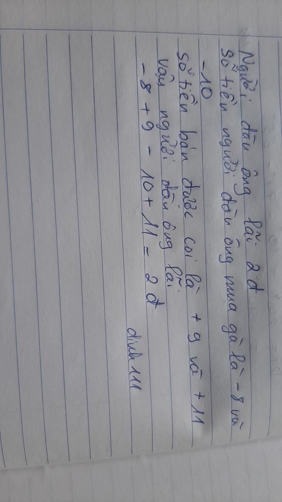 1 người đàn ông mua 1 con gà giá 8đ.Rồi mua lại giá 9đ . Rồi lại bán với giá 10đ và cuối cùng mua lại với giá 11đồng
