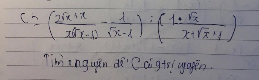 `C=((2sqrt(x)+x)/(xsqrt(x)-1)-(1)/(sqrt(x)-1)):(1-(sqrt(x))/(x+sqrt(x)+1))` với `x \ne 1; x>=0`