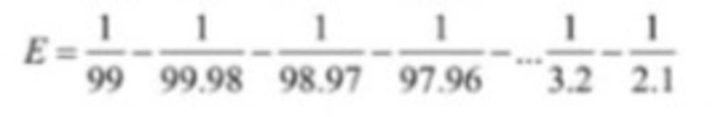 `E = 1/99 - 1/(99.98) - 1/(98.97) - ... - 1/(3.2) - 1/(1.2)`