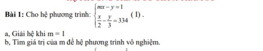 Ta cho hệ phương trình: $\begin{cases} mx-y=1\\\dfrac{x}{2}-\dfrac{y}{3}=334\\ \end{cases}$ `(I)`