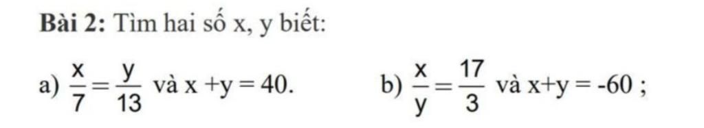 `x/7 = y/13 = (x + y)/(7 + 13) = 40/20 = 2`