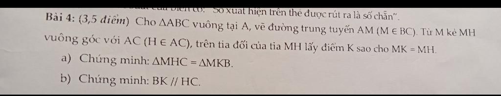 Bài 4: (3,5 điểm) Cho AABC vuông tại A, vẽ đường trung tuyến AM (M ∈ BC). Từ M kẻ MH