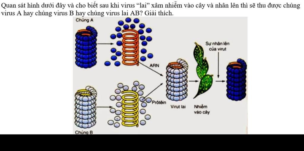 Quan sát hình dưới đây và cho biết sau khi virus “lai” xâm nhiễm vào cây và nhân lên thì sẽ thu được chủng