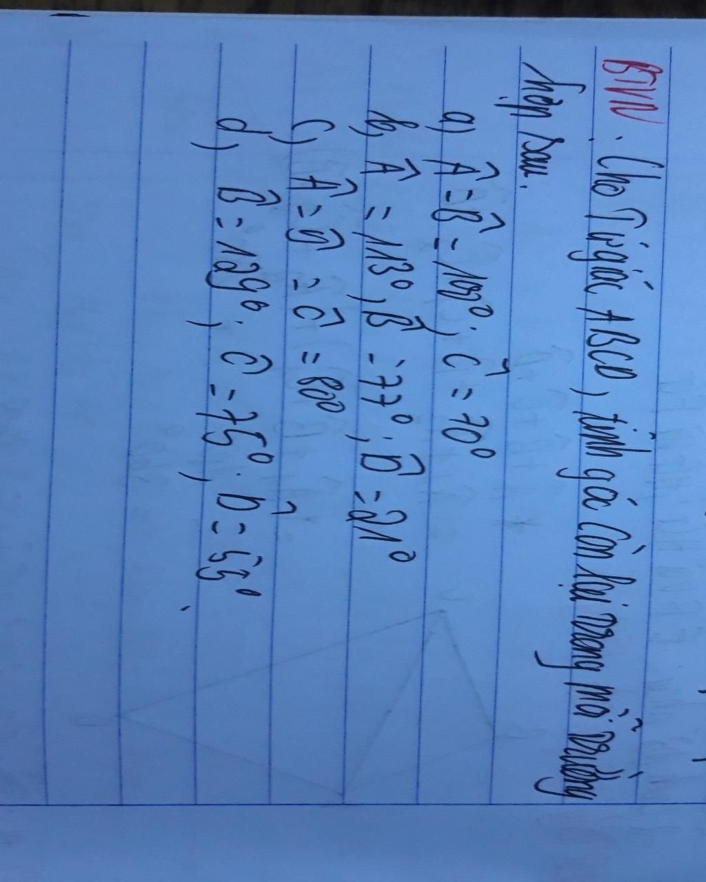 `d)` Áp dụng tính chất tổng 4 góc của một tứ giác :