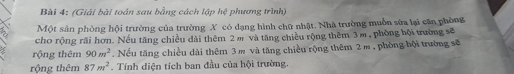 Do vậy diện tích phòng hội trường rộng thêm `87m^2` nên ta có phương trình :
