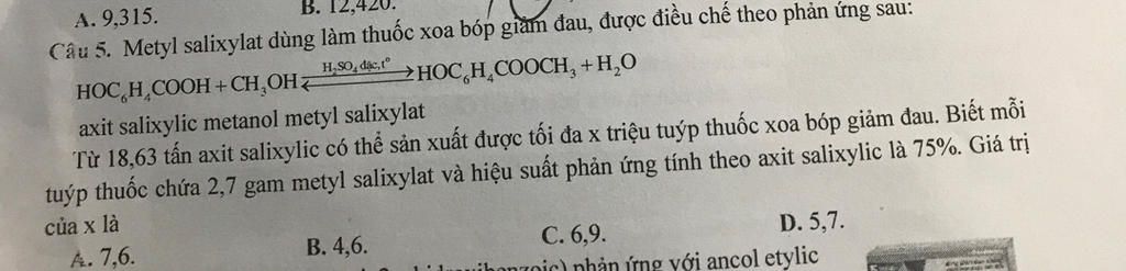 Câu 5. Metyl salixylat dùng làm thuốc xoa bóp giảm đau, được điều chế theo phản ứng sau: