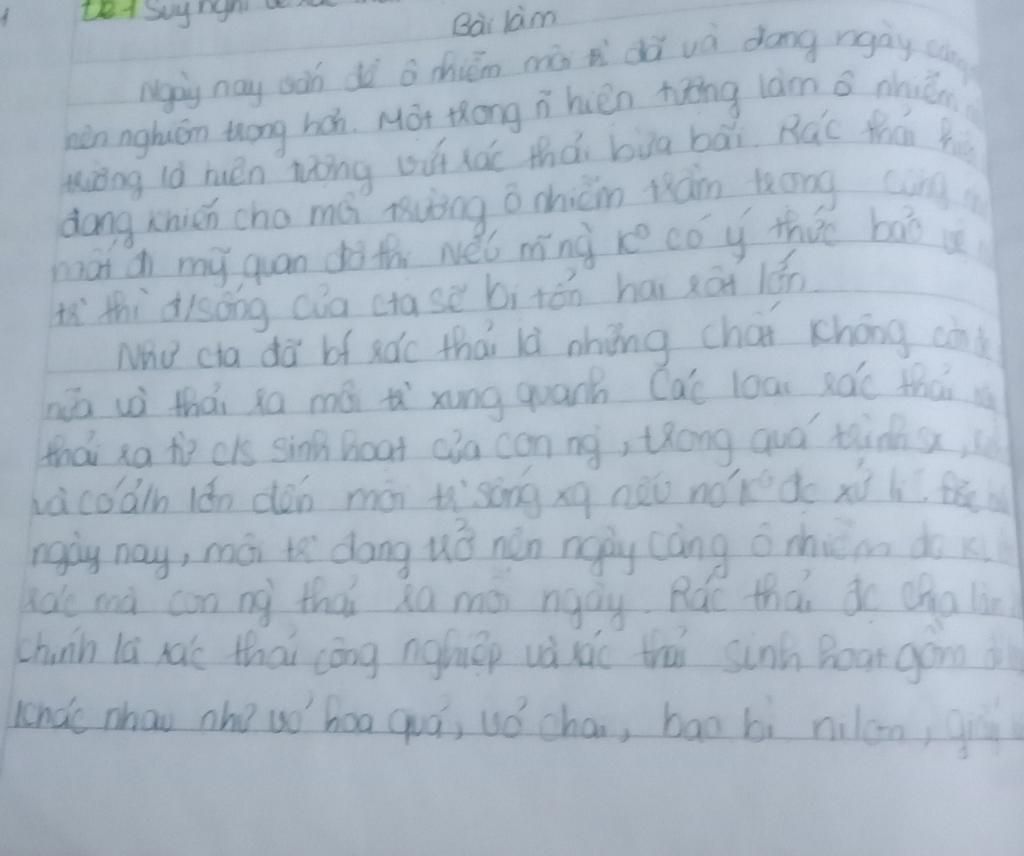 Môi trường có vai trò vô cùng quan trọng, thậm chí có ý nghĩa quyết định đối với cuộc sống của con người. Trước hết, môi trường là không gian sinh sống, tồn tại của con người; đồng thời cũng là nơi cung cấp tài nguyên thiên nhiên phục vụ cho đời sống của chúng ta. Nhờ có đất đai, con người có thể xây dựng nhà cửa, nơi cư trú an toàn. Đất đai còn là nơi để con người trồng trọt, canh tác và thực hiện công cuộc lao động sản xuất để trồng trọt và tạo ra lương thực, thực phẩm. Những cánh rừng xanh là nơi cung cấp nguồn oxi trong lành và được ví như những lá phổi xanh của nhân loại, đồng thời có tác dụng chống lại những tác động của thiên tai như ngăn chặn xói mòn, sạt lở đất. Biển xanh, đại dương bao la là nguồn cung cấp hải sản phong phú cho con người,... Vậy mà hiện nay, môi trường sống đang bị ô nhiễm một cách nghiêm trọng.