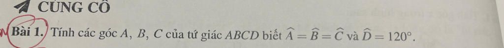 Vì `\hat{A}=\hat{B}=\hat{C}` và `\hat{D}=120^o`