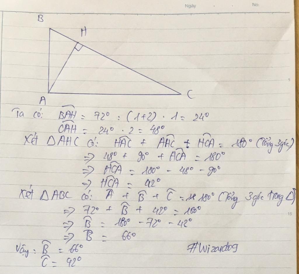 cho tam giác abc từ a kẻ đường vuông góc với bc.tại H biết BAH = 2CAH , BAC = 72 độ.Tính góc B và góc C