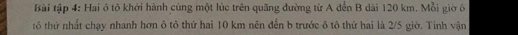 Vì ô tô thứ nhất đến `B` trước ô tô thứ hai là `2/5` giờ nên