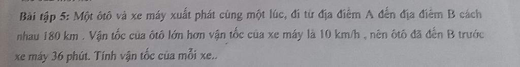 Vì ô tô đến B trước xe máy 36 phút `= 3/5` giờ nên ta có pt: