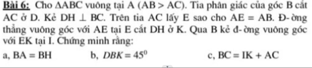 Bài 6: Cho AABC vuông tại A (AB > AC). Tia phân giác của góc B cắt