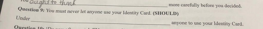 Đáp án: Under no circumstances should you let anyone use your Identity Card.