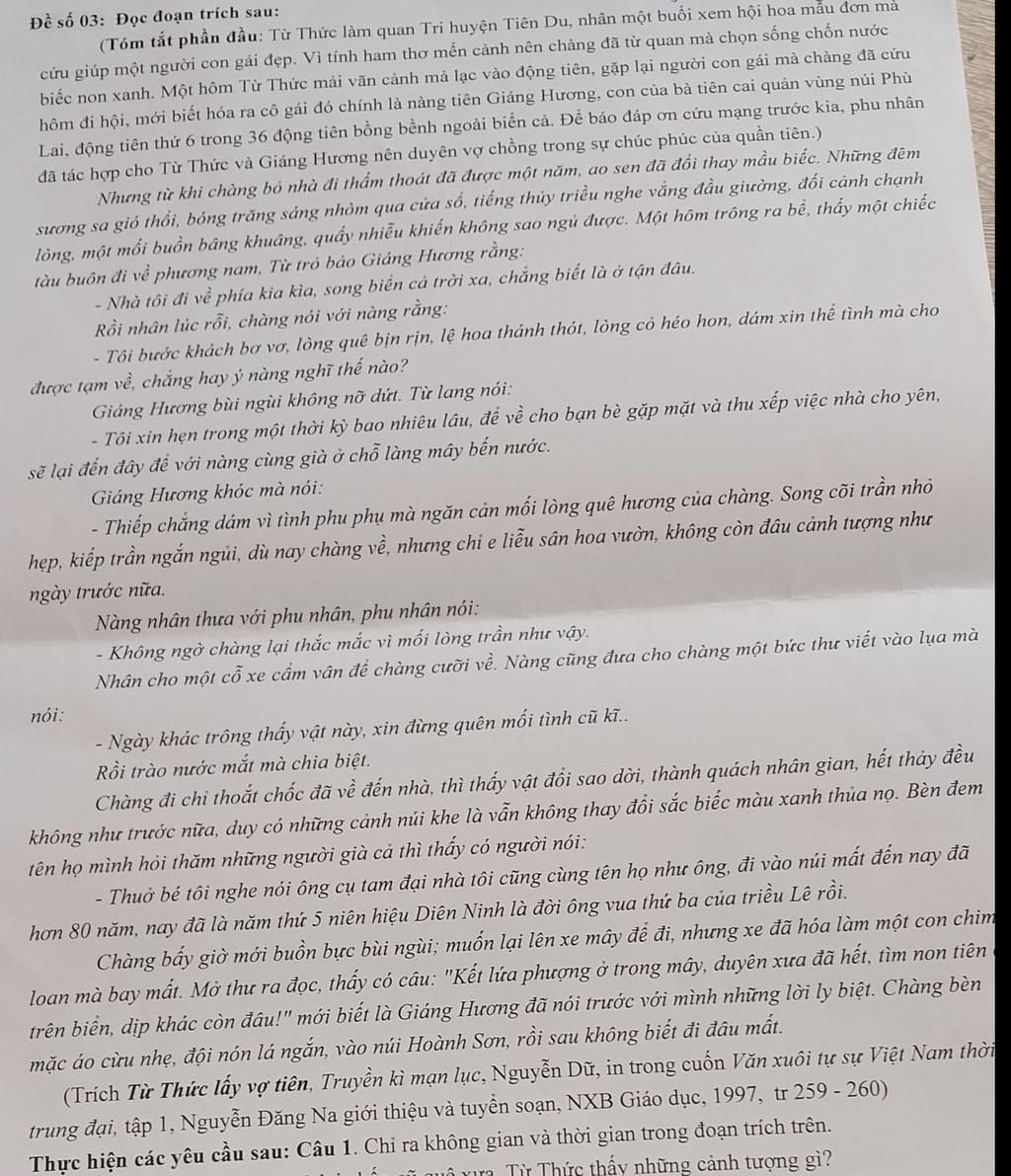 chỉ ra không gian và thời gian trong đoạn trích Từ Thức lấy vợ tiên