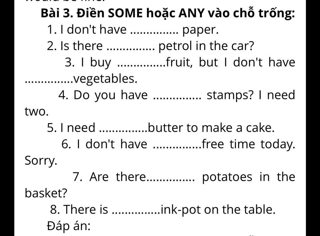`**` Ta dùng any cho dạng câu phủ định và nghi vấn
