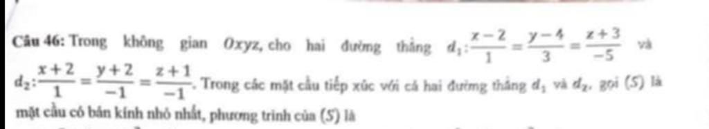 Hai đường thẳng `d_1:(x-2)/1=(y-4)/3=(z+3)/-5` và `d_2:(x+2)/1=(y+2)/-1=(z+1)/-1` lần lượt có VTCP là `\vec{u_1}=(1;3;-5)` và `\vec{u_2}=(1;-1;-1)`