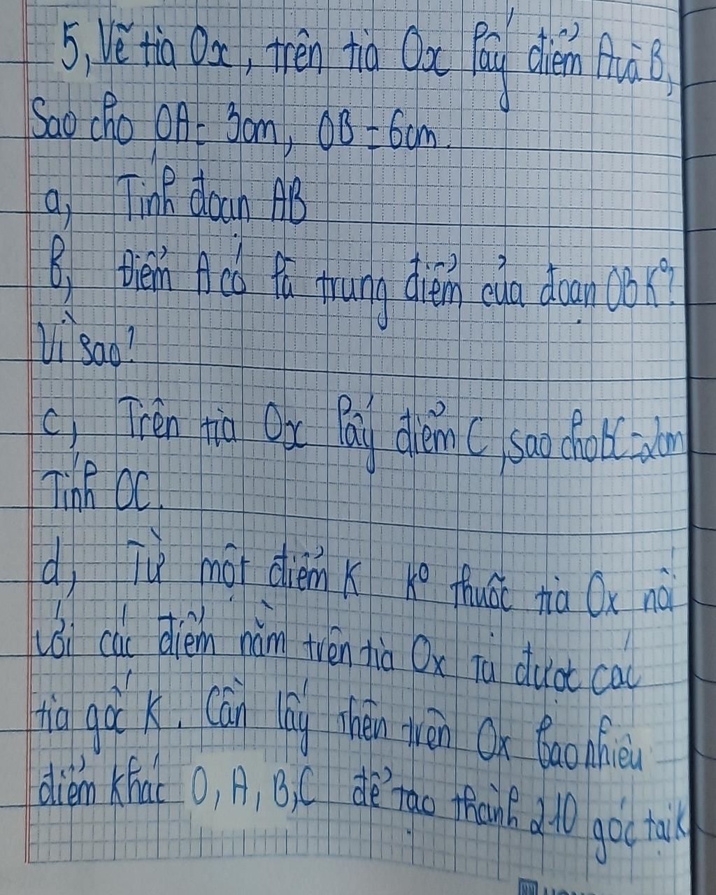 `a)` Trên tia `Ox`, có `OA` < `OB` ( vì `3` cm < `6` cm )