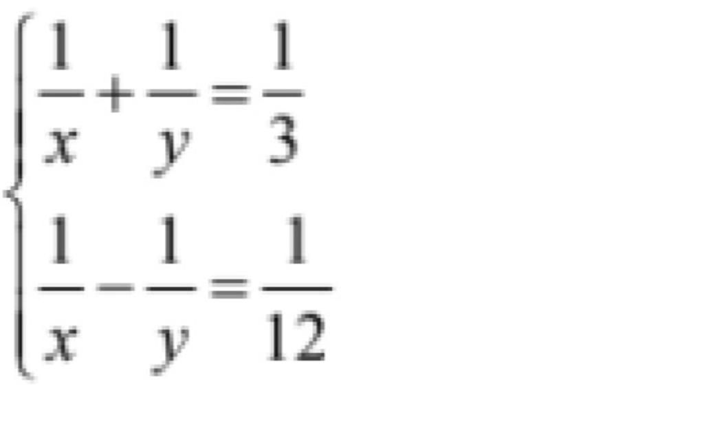 $\begin{cases} \dfrac{1}{x} +\dfrac{1}{y}=\dfrac{1}{3}\\\dfrac{1}{x}-\dfrac{1}{y}=\dfrac{1}{12} \end{cases}$