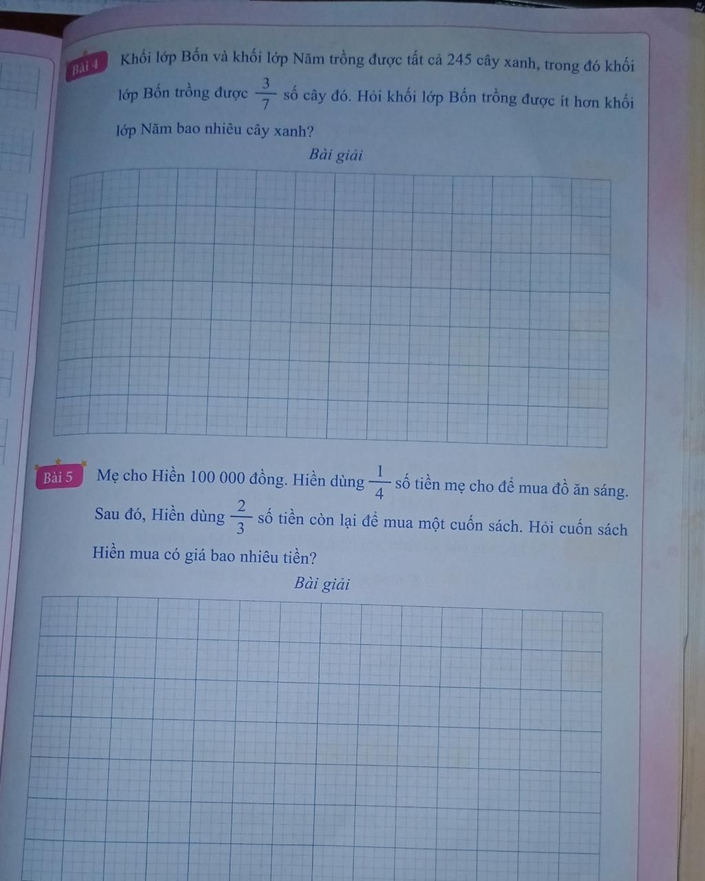 Khối lớp `4` trồng ít hơn khối lớp `5` số cây là: