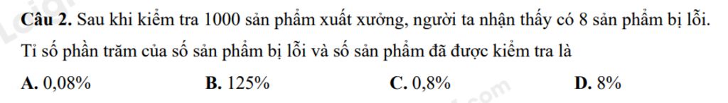 Sau khi kiểm tra 1000 sản phẩm xuất xưởng, người ta nhận thấy có 8 sản phẩm bị lỗi. Tỉ số phần trăm của số sản phẩm bị lỗi và số sản phẩm đã được kiểm tra là A. 0,08% B. 125% C. 0,8% D. 8%