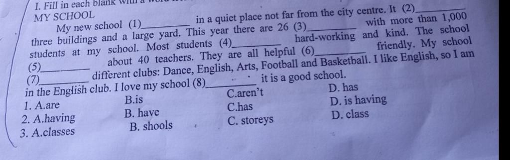 -There are + số nhiều, loại D, không thể chọn B vì không thể có trường trong trường của tôi, loại C vì 1000 student không liên quan tới storyes