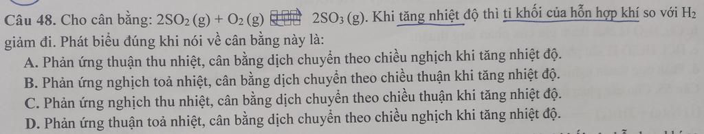 Theo nguyên lí chuyển dịch cân bằng thì không có dòng đầu đâu, với lại `DeltaH >0` là thu nhiệt mà nhỉ