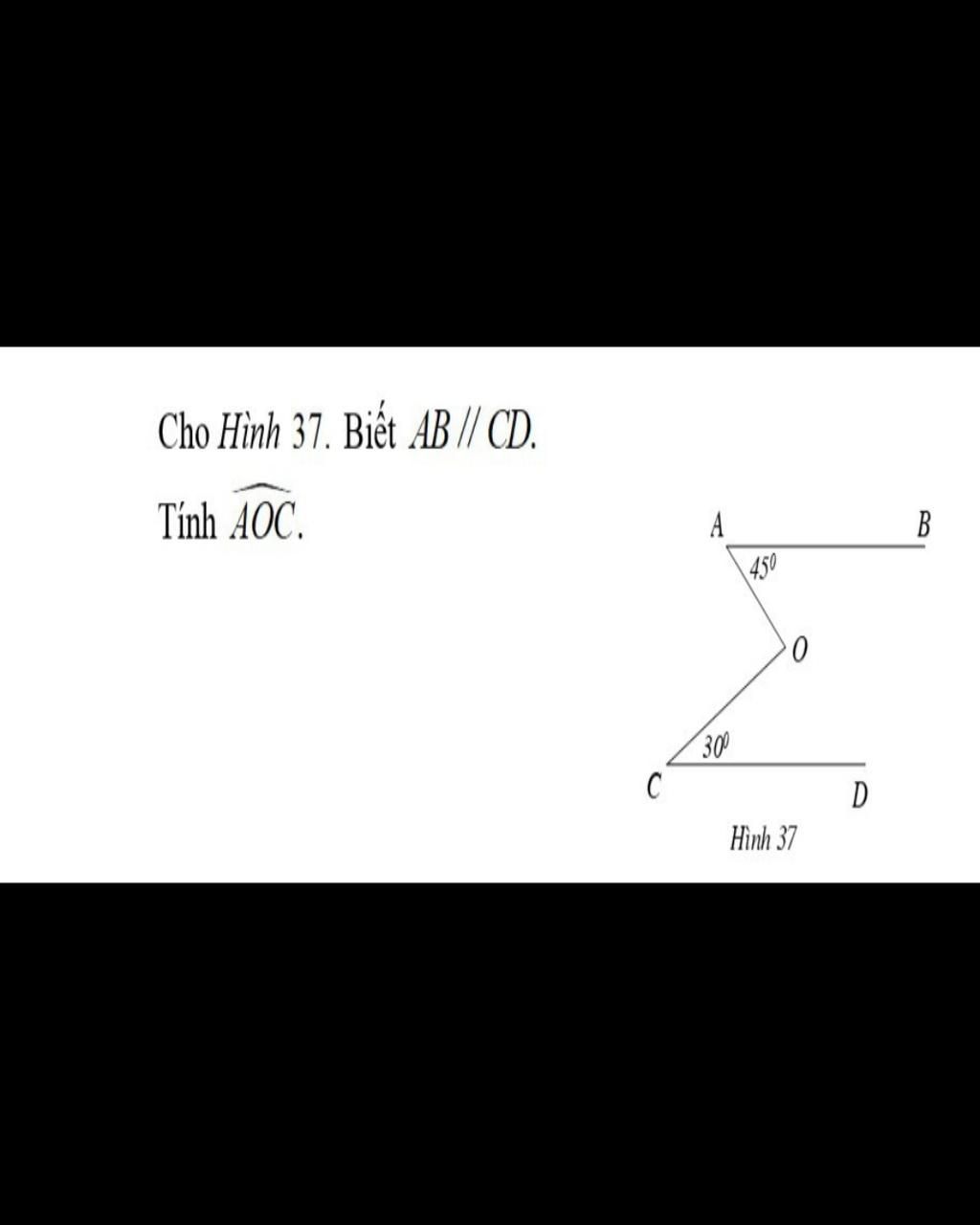 Từ `( 1 ) ; ( 2 ) => hat{AOC} = hat{BAO} + hat{DCO} = 45^@ + 30^@ = 75^@`