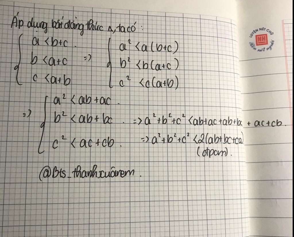 Cho a, b, c là độ dài ba cạnh tam giác. CMR: a2 + b2 + c2 < 2(ab + bc + ac)