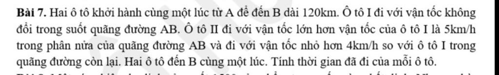 Thời gian xe `2` di chuyển nửa quãng đường sau là: `120/(2(x-4)) = 60/( x - 4 )` ( giờ )